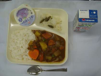 「ビーフカレーライス(米粉) 野菜のピクルス ぶどうゼリー 牛乳」
