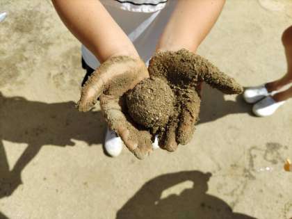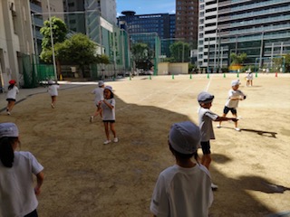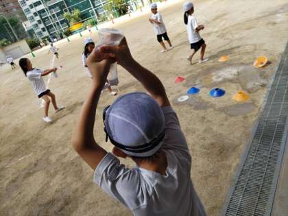 今日は、生活科の学習で水遊びをしました。各家庭から持ってきた容器をうまく使って遠くまで水を飛ばしたり、地面にお絵描きをしたりしました。中には、どろ団子作りを楽しむ子どもたちもいました。