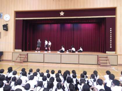 台本を自分たちで作り、みんなで練習して全校児童の前で披露しました。
