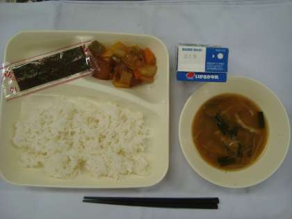 「酢豚 中華みそスープ 焼きのり ごはん 牛乳」