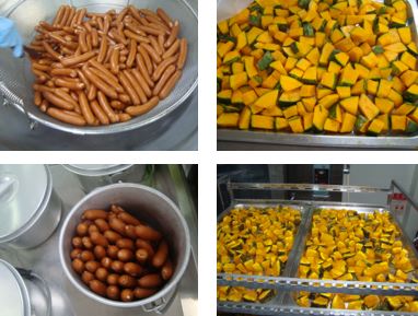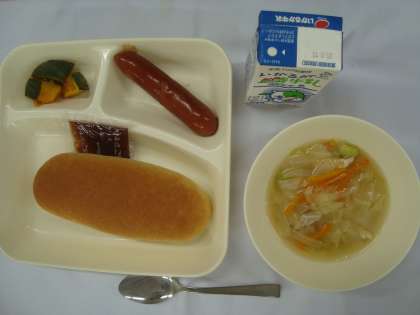 「ウインナーのケチャップソース スープ 焼きかぼちゃ コッぺパン いちごジャム 牛乳」