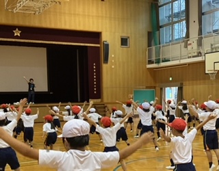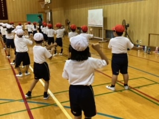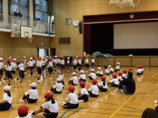 今日は、団体演技の練習を2学年合同で行いました。練習の最後には、ミニ発表会を行い、それぞれの演技の良いところを伝え合う活動も取り入れました。「体を大きく動かせていました。」等と褒めてもらい、嬉しそうな笑顔が見られました。