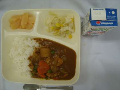「チキンカレーライス(米粉のカレールウ使用) キャベツとコーンのサラダ 白桃(カットかんづめ) 牛乳」