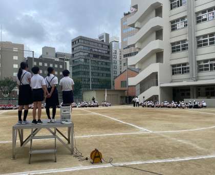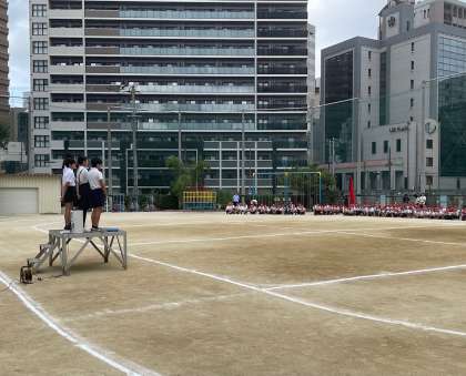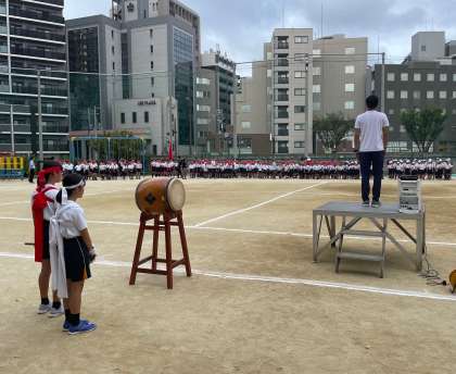 運動会に向けた体育朝会の様子です。まずは、運営委員会の子どもたちが、新校舎に掲げている運動会のテーマについて、みんなにお知らせをしました。