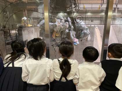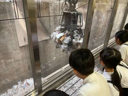 この「ごみピット」の容量は、7,000㎥です。小学校のプールでおよそ20杯ほどの量になります。ごみをつかむ「ごみクレーン」は、一度に5トンもの量をつかむことができます。遠隔操作されたクレーンは、ごみを「投入ホッパ」に運びます。