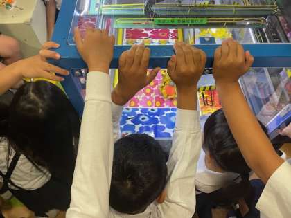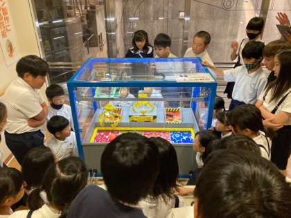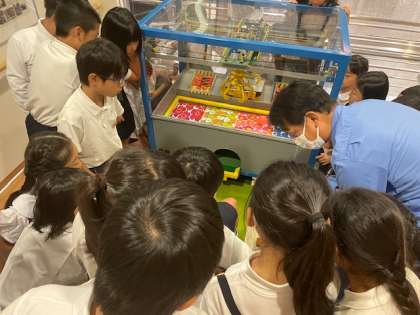 このコーナーには、子どもたちがクレーン操作を体験できるミニチュアクレーンが置いてあります。ゲーム感覚で楽しく学習することができました。