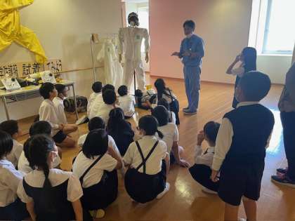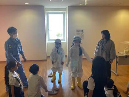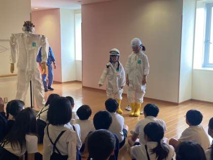 焼却炉などを点検する際に、作業員の方々が安全のために着用される化学防護服です。子どもたちも試着させていただきました。