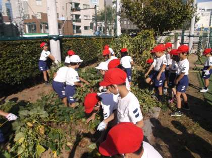 10月14日(水)においもほりとごまの収穫をしました。とてもおいしそうなさつまいもができていました。おいもは、子どもたちの顔ぐらいの大きさのものもありました。おいもパーティーが楽しみです。ごまも立派に育っていました。ごまは、これから乾燥させてから種を取ります。みんなで一生懸命に世話をしてきた成果です。