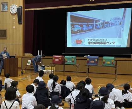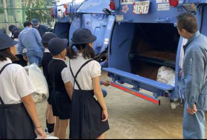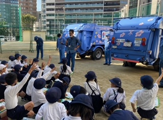 4年生の子どもたちは、パッカー車体験をしました。実際にゴミの積み込みを体験したり、運転席に座らせていただいたりもしました。ゴミ収集の大変さや大切さをしっかりと学ぶことができました。また、ゴミの分別やリサイクルについても詳しく教えていただきました。