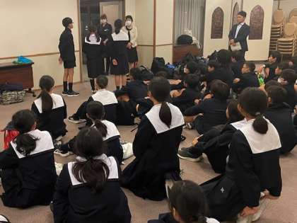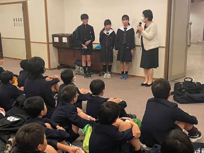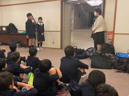 楽しく活動した「志摩スペイン村」を出て、宿舎の「扇芳閣」に到着し、会議室で開舎式を行いました。児童代表からあいさつをしたあと、宿舎の方からのお話を聞きました。