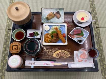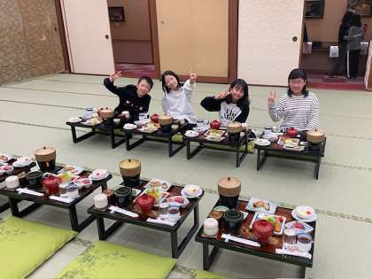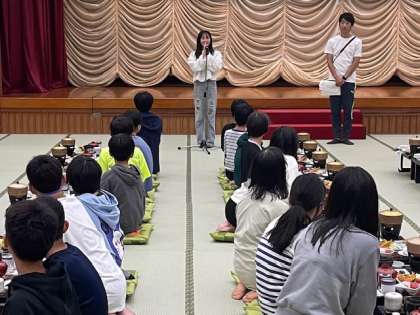 入浴後、待ちに待った夕食の時間です。一番乗りのグループが席に着きました。係の児童の合図で、「感謝して、いただきます!」