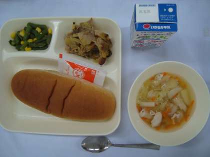 「豚肉のカレー風味焼き 鶏肉と野菜のスープ さんどまめとコーンのサラダ〔ノンエッグドレッシング〕 黒糖パン 牛乳」