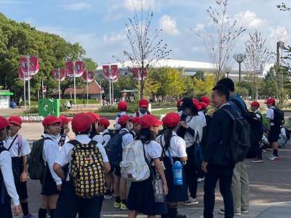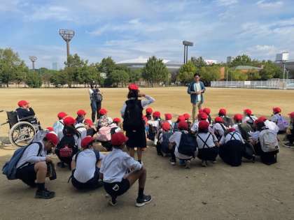 長居公園に着きました。とても広いグラウンドを見て、子どもたちのワクワク感が高まってきました。