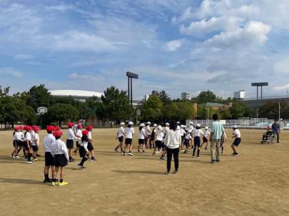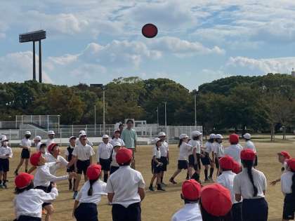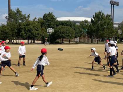 さっそく遊びを始めます。レク係の子どもたちが選んだ遊びは、フリスビードッジです。まずは、い組対ろ組の対決です。