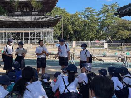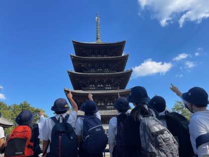 そして、最後の見学地は、古都奈良を象徴する塔である、興福寺五重塔です。青い空を突き刺すように、凛と立っています。