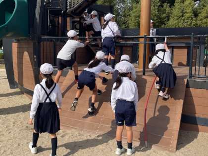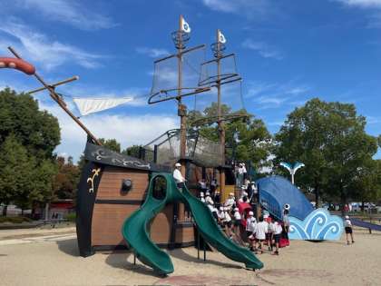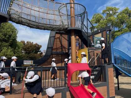 芝生で気持ちよく過ごしたあとは、大きな遊具のある広場に移動しました。安全に気をつけながら楽しく遊びました。