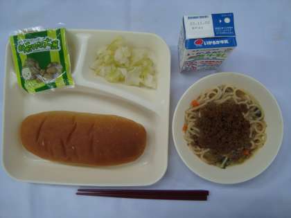 「タンタンめん あっさりキャベツ まっ茶大豆 黒糖パン 牛乳」