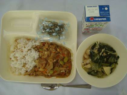「ピリ辛丼 中華スープ ミニフィッシュ 牛乳」