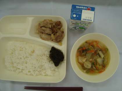 「豚肉のスタミナ焼き すまし汁 のりのつくだ煮 ごはん 牛乳」