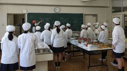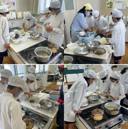 5年生の家庭科の時間です。調理実習で、ごはんとみそ汁をつくります。グループ内で分担しながら、テキパキと動きます。包丁さばきもなかなかのものです。