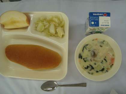 「きのこのクリームシチュー キャベツのピクルス りんご 黒糖パン 牛乳」
