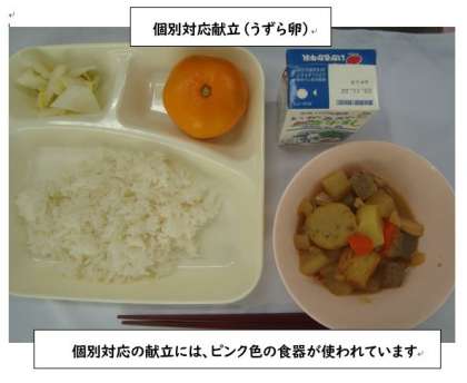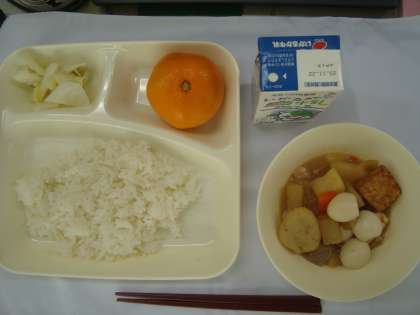 「関東煮(個別対応献立:うずら卵)はくさいの甘酢あえ みかん ごはん 牛乳」