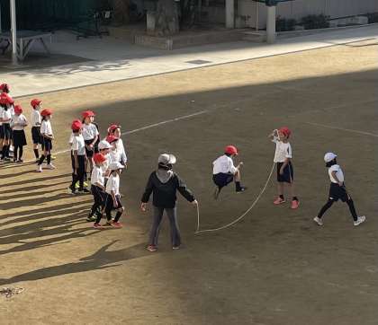 2年生の体育の時間です。なわとびチャレンジ月間ということもあり、クラスごとに大なわに取り組みました。何回続けて跳べるか、みんなで力を合わせてチャレンジです。