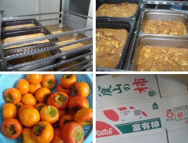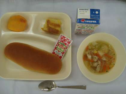 「ツナポテトオムレツ スープ かき(富有柿) パン 牛乳」