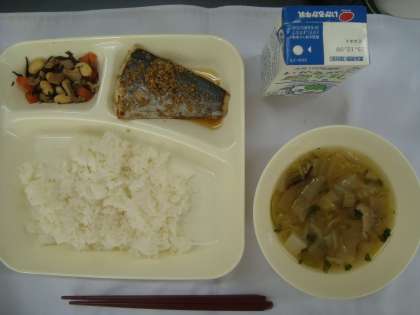 「さごしのごましょうゆかけ うすくず汁 大豆の煮もの ごはん 牛乳」
