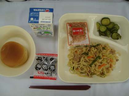 「和風やきそば きゅうりのしょうがづけ すまし汁 いり黒豆 パン 牛乳」