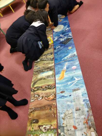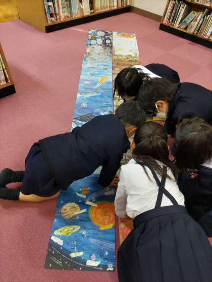 今日は図書の時間に、自分の好きな本をゆっくりと読むことができました。横に広げると長く伸びる、迫力ある絵本を書架の中から見つける子もいました。子どもたちは大喜びで、床に広げて楽しそうに読み合っていました。