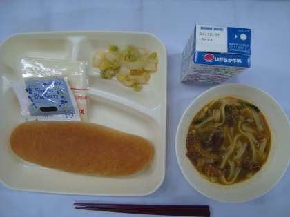 「カレーうどん はくさいのおひたし スライスチーズ コッぺパン ブルーベリージャム 牛乳」