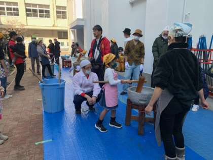 校下子ども会主催の「もちつき大会」が開催され、たくさんの子どもたちが集まりました。いくつものグループに分かれて、餅つきやドッジボール、ゲーム大会を思い切り楽しみました。つきたてのお餅やおいしいお雑煮にみんな大喜び! 関係スタッフの皆さん、ありがとうございました。