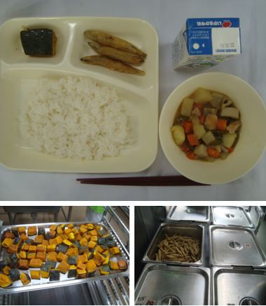 「きびなごてんぷら 含め煮 焼きかぼちゃの甘みつかけ ごはん 牛乳」