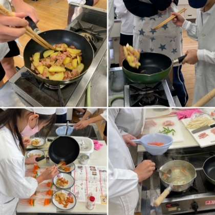 今回の調理実習は「まかせてね、今日の食事」という単元で、ベーコン巻きやジャーマンポテト、野菜炒め等を作りました。じゃがいも、にんじん、インゲン豆、えのきと色とりどりのベーコン巻きが特に美味しそうでした。