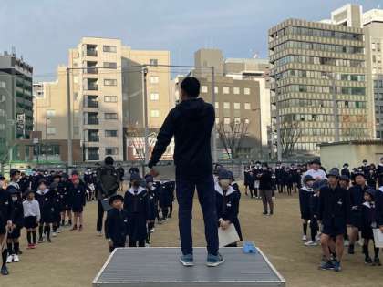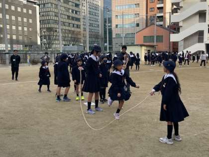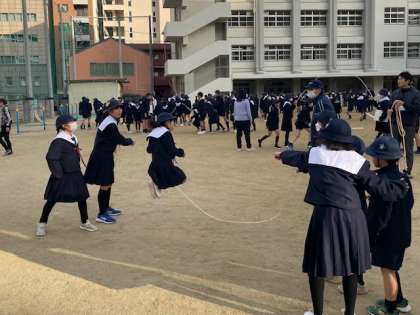 寒さに負けない体をつくるために、全校児童がたてわり班に分かれて、大なわ集会に取り組んでいます。