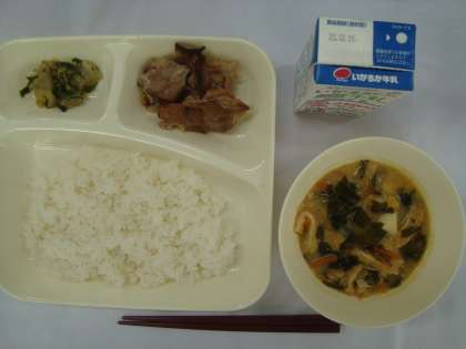 「豚肉のねぎじょうゆ焼き みそ汁 きくなとはくさいのごまあえ ごはん 牛乳」