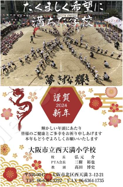 本年も、西天満小学校の子どもたちが元気に楽しく学校生活を送ることができるよう、全教職員一丸となって頑張ってまいります。