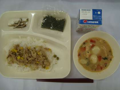 「れんこんのちらしずし ぞう煮 ごまめ 牛乳」