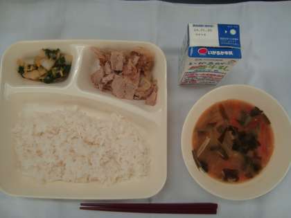 「豚肉のごまだれ焼き みそ汁 きくなとはくさいのおひたし ごはん 牛乳」