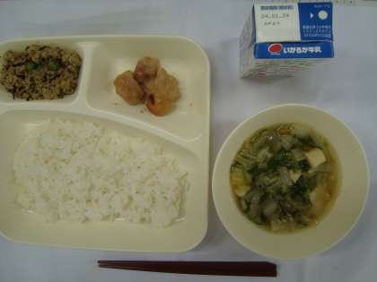 「鶏肉の甘みそ焼き 五目汁 高野どうふのいり煮 ごはん 牛乳」