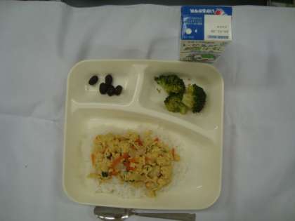 「親子丼 ブロッコリーのごまあえ 黒豆の煮もの 牛乳」(食物アレルギー対:鶏卵)