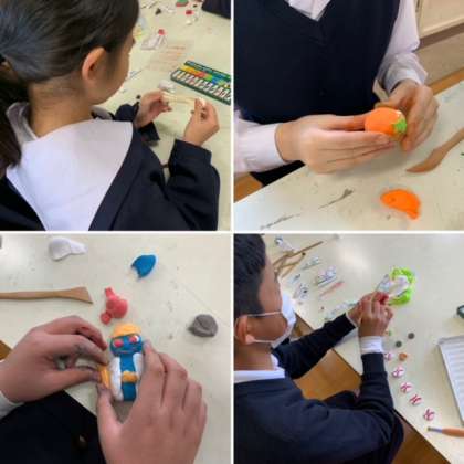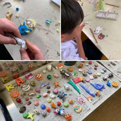 紙粘土に絵の具を練り込んで、裏から磁石をつけてオリジナルマグネット作りをしました。作品自体が小さいので、細かい作業が難しそうでしたが、どの子も素敵なマグネットが完成しました!「お家の冷蔵庫に貼るのが楽しみ!」と嬉しそうな子どもたちでした。