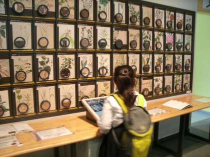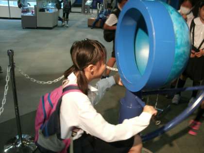 科学館では初めに展示場を見学しました。4階「宇宙とその発見」では月の満ち欠けを体験したり、隕石を触ったりしました。3階「身近に化学」では、「におい食堂」でたこやきやバニラのにおいを楽しんだり、大きな水晶の結晶を見たりしました。2階「おやこで科学」では、たくさんの鏡に映る自分の姿に驚いたり、なつかしいおもちゃで遊んだりしました。