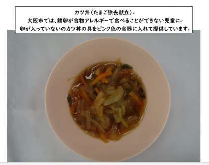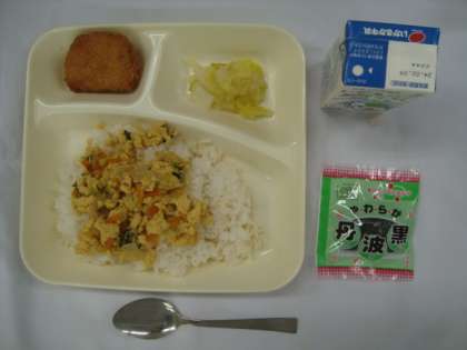 「カツ丼(たまご除去献立) はくさいの甘酢あえ ソフト黒豆 牛乳」