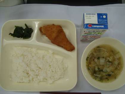 「たらフライ うすくず汁 ほうれん草のおひたし ごはん 牛乳」