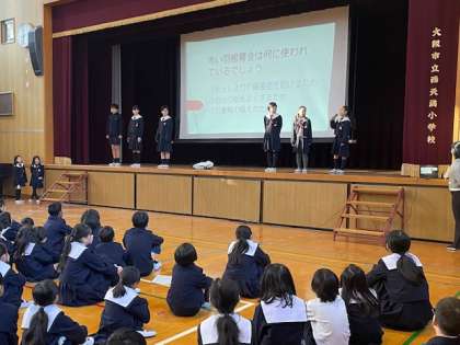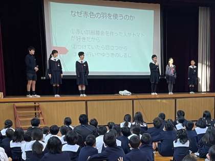 今回は、まず、運営委員会の子どもたちが、「赤い羽根募金」についてのお知らせをしました。赤い羽根に関するクイズを出しながら、楽しくアナウンスしてくれました。来週の火曜日から木曜日まで、朝、校門に立って募金活動を行います。