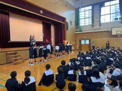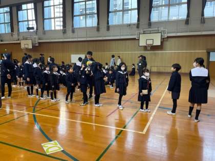 続いて、今回のゲーム「ボールまわしリレー」を行いました。グループごとに一列で並んで、頭の上や横から次の人にボールを回していきます。低学年の子にうまくアドバイスしながら、協力して回していました。