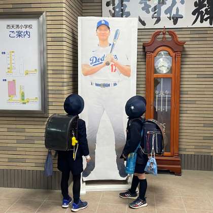 グローブが送られてきた日から、学校の玄関に大谷選手の等身大パネルを展示しています。登校してくる子どもたちは、時おりせいくらべをしてから教室に向かっています。この日も、1年生の子が「おっきいね!」と言いながら、大谷選手を見あげていました。