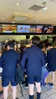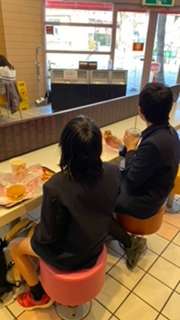 昼食を食べているグループがいました。ダブルチーズバーガーセットを注文して、美味しくいただいていました。